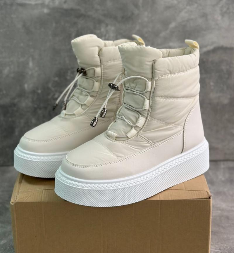 Продам женские теплые дутики молочного цвета, российский 40 размер ( по стельке 26 см.). Затягиваются шнуровкой по ноге.